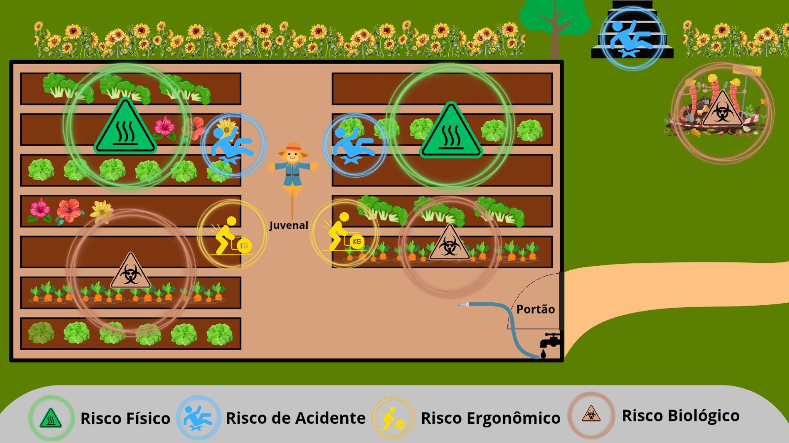 Durante a atividade, os estudantes realizaram análises em campo para identificar riscos físicos, químicos, biológicos, ergonômicos e de acidentes. A partir dessas observações, elaboraram um mapa de riscos em formato didático e visual, além de proporem ações preventivas e de controle, adaptadas à realidade da horta.
